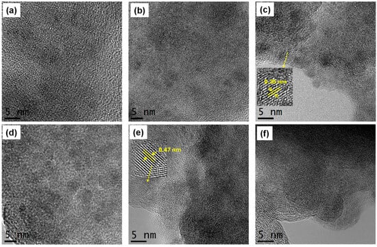 Figure 3 shows high-resolution transmission electron microscopy (HR-TEM) images of the different TiO2-based materials prepared as photosensitizers. The TiO2 sample exhibits a combination of amorphous and crystalline regions (Figure 3a,b), with the crystalline areas likely corresponding to the anatase phase. In the TiO2 sample functionalized with folic acid (TiO2-FA), an increased degree of crystallinity is observed, suggesting that folic acid promotes anatase phase formation (Figure 3b,c). Upon the addition of ZnPc, well-defined crystalline domains appear, although amorphous regions remain visible across all samples. The HR-TEM images were also used to measure the interplanar spacing of the TiO2-FA and TiO2-FA-ZnPc samples. For TiO2-FA, an interplanar spacing of approximately 0.35 nm was calculated, corresponding to the (101) plane of anatase (Figure 3c). In the TiO2-FA-ZnPc sample (Figure 3e), a distinct crystalline region displays a lattice spacing of 0.47 nm, which matches the (202) plane of ZnPc and is consistent with reported values [].