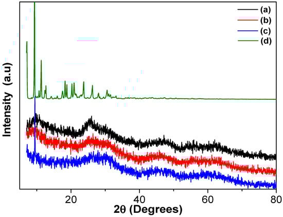 XRD patterns of the different TiO2 materials: (a) TiO2, (b) TiO2-FA, (c) TiO2-FA-ZnPc, and (d) ZnPc.