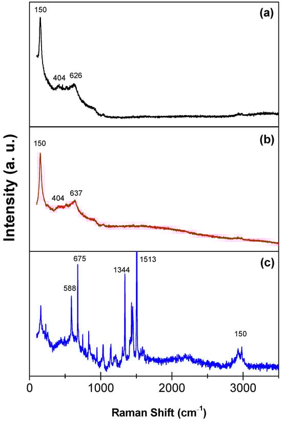 Figure 5 shows the Raman spectra of the TiO2, TiO2-FA, and TiO2-FA-ZnPc samples over the 0–3500 cm−1 range. In Figure 5a, the TiO2 sample displays a strong, well-defined peak at 150 cm−1, attributed to the Eg(2) mode of the anatase crystalline phase. The band at 623 cm−1 corresponds to another Eg mode, and the peak at 404 cm−1 is assigned to the B1g mode of anatase []. The Raman spectrum of TiO2-FA is very similar to that of TiO2, with a slight shift of the band at 637 cm−1 due to the presence of folic acid (Figure 5b), indicating its good dispersion within the TiO2 network. In the spectrum of TiO2-FA-ZnPc (Figure 5c), additional distinct peaks appear alongside the TiO2-related bands. According to the literature, the peak at 588 cm−1 arises from benzene ring deformation, the 675 cm−1 peak is attributed to the macrocycle, and the bands at 1344 cm−1 and 1513 cm−1 are associated with the Zn metal ion coordinated to the phthalocyanine structure [,]. In the 2000–3800 cm−1 region, carbon-related vibrational modes from ZnPc are also evident.