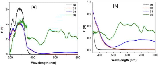 UV–Vis spectra of the different TiO2-based materials in their solid state (A) in the 200–800 range and (B) in the 350–800 range, respectively. (a) TiO2, (b), TiO2-FA, (c) TiO2-FA-ZnPc, and (d) ZnPc.