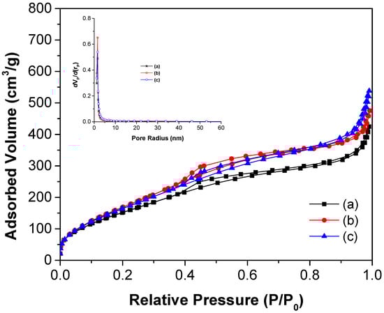 N2 adsorption–desorption isotherms of (a) TiO2, (b) TiO2-FA, and (c) TiO2-FA-ZnPc materials. The insert shows the pore size distribution of the materials.