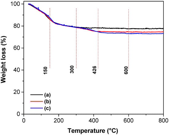 TGA curves of the different TiO2-based materials: (a) TiO2, (b) TiO2-FA, and (c) TiO2-FA-ZnPc.
