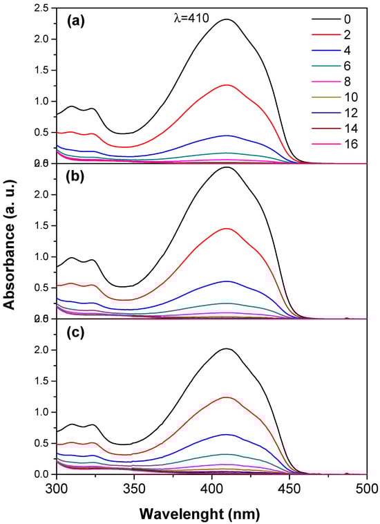 UV–Vis spectra of the 1,3-diphenylisobenzofuran (DPBF) in the presence of the TiO2 samples after irradiation with UV light for different times (0–16 min). (a) TiO2, (b) TiO2-FA, (c) TiO2-FA-ZnPc.