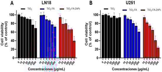Viability of (A) LN18 and (B) U251 cells after treatment with different concentrations of TiO2 (black), TiO2-FA (blue), and TiO2-FA-ZnPc (red) nanoparticles (24 h). The standard deviations are indicated with the error bars.