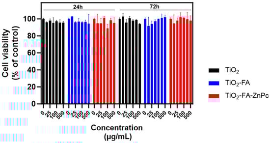 Viability of BJ cells after treatment with different concentrations of TiO2, TiO2-FA, and TiO2-FA-ZnPc nanoparticles (24 h and 72 h). The standard deviations are indicated with the error bars.