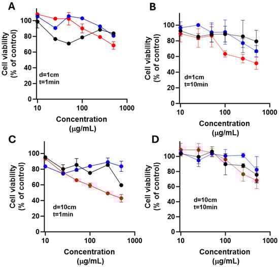 Effect of nanoparticles over cell viability after irradiation on LN18 cells. The cells were exposed to LED light at 385 nm for 1 min (A,C) or 10 min (B,D) with 1 cm (A,B) and 10 cm (C,D) from irradiation source after placing TiO2 (black), TiO2-FA (blue), and TiO2-FA-ZnPc (red) nanoparticles in cells; followed; after 24 h, cell viability was determined. Results are expressed as means ± SEM.