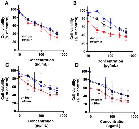 Cells were exposed to LED light at 385 nm for 1 min (A and C) or 10 min (B and D), using distances of 1 cm (A and B) and 10 cm (C and D) from the irradiation source. After 24 h, cell viability was determined. Results are expressed as means ± SEM.