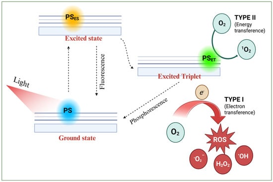PDT relies on three key components: a light source (UV and/or visible), a photosensitizer (PS) that absorbs at the corresponding wavelengths, and sufficient molecular oxygen [,]. In practice, the PS is administered (orally, subcutaneously, or intravenously) and accumulates in the tumor. Once localized, it is irradiated to induce excitation from the ground state to higher energy states [,]. According to the literature, several processes can occur during excitation (see Scheme 1) []: (1) the PS transitions from its ground state to an excited singlet state (PSES); (2) this state may relax back to the ground state via fluorescence or non-radiative decay; or (3) it may convert to a longer-lived triplet state (PSET). The PSET species can then generate reactive oxygen species (ROS) via two pathways (Scheme 1): in a type I reaction, electron or proton transfer produces radicals that react with oxygen to form peroxides, hydroxyl radicals, or superoxide ions. In a type II reaction, energy is directly transferred to molecular oxygen, generating singlet oxygen. These ROS are cytotoxic and can induce apoptosis or necrosis in targeted cells [].