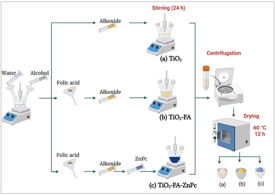 Three samples were synthesized via the sol–gel method: pure TiO2, TiO2 functionalized with folic acid (TiO2-FA), and TiO2-FA loaded with zinc phthalocyanine (TiO2-FA-ZnPc). The molar ratios were alkoxide:water (1:16) and alkoxide:alcohol (1:8). A total of 0.5 g of FA and ZnPc was added. The synthesis procedure is illustrated in Scheme 2.