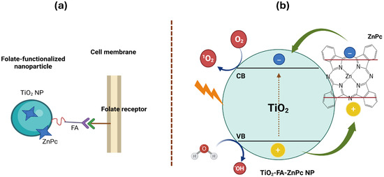 (a) A schematic representation of the functionalization of a TiO2 nanoparticle with folic acid and loaded with ZnPc and its subsequent entry into a cell via folate receptors and (b) the ROS formation when TiO2-FA-ZnPc nanoparticle is irradiated with UV light.