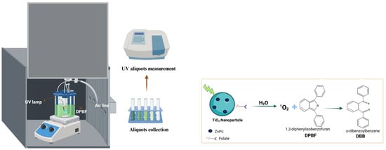 1,3-Diphenylisobenzofuran (DPBF) was used as a fluorescent probe to evaluate singlet oxygen formation. Briefly, 200 mL of a 40 ppm DPBF solution was placed in a custom-made photoreactor equipped with water recirculation and air flow. The solution was bubbled with air for 20 min. Subsequently, 200 mg of the TiO2 system was added and allowed to interact with the solution for 5 min. The mixture was then irradiated with a UV lamp at 254 nm (2.2 mW, UVP company, Upland, CA, USA). Aliquots were collected every 2 min for analysis by UV–Vis spectroscopy using a Cary100SCAN UV–Vis spectrophotometer (Palo Alto, CA, USA).