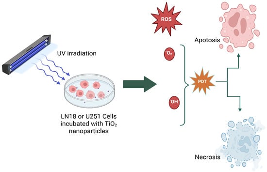 TiO2 also offers a large surface area, mesoporous structure, high stability, low toxicity, and good biocompatibility, making it attractive for biomedical applications [,,]. It has been explored as a biomaterial in implants, biosensors, drug delivery systems, antimicrobial agents, and tissue engineering. Notably, TiO2’s ROS-generating capability under light irradiation has led to its investigation as a therapeutic agent in photodynamic therapy (PDT) for cancer treatment [,,]. Upon activation by UV light, TiO2 can induce damage to cellular components such as DNA, membranes, and lipids, ultimately triggering cell death through apoptosis, necrosis, or autophagy. PDT applications of TiO2 have been reported effective against a variety of cancer cell lines, including breast (4T1), epithelial (KB), glioblastoma, non-small cell lung (A549), cervical (HeLa), and breast epithelial cells (MCF7, MDA-MB-231, NSCLC) [,,,,]. Compared to traditional treatments, PDT is less invasive, with reduced toxicity and shorter treatment times, and is clinically approved. PDT may also complement surgery, chemotherapy, or radiotherapy.