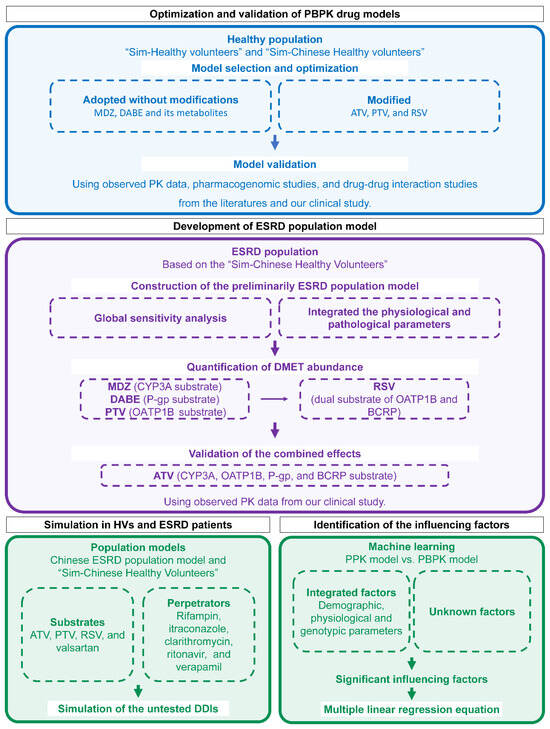 The overall workflow is illustrated in Figure 1. Firstly, five substrate drug models were validated using PK data in HVs from the literature and our previous study [27]. Next, based on the built-in “Sim-Chinese Healthy Volunteers” population model in Simcyp, the ESRD population model was developed by incorporating physiological parameters and DMET functions specific to Chinese ESRD patients. Then, DDDIs between substrates and perpetrators were evaluated through simulations using the established model. Lastly, influencing factors for individual clearance were identified and quantified.