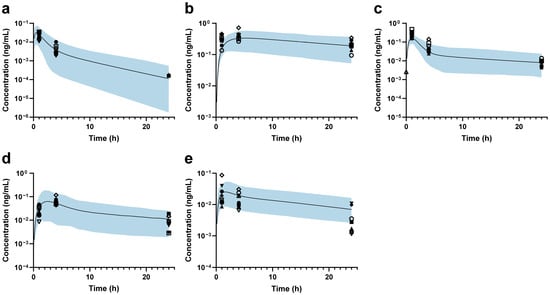 Relevant clinical PK data for all five drugs were systematically searched in PubMed (https://www.ncbi.nlm.nih.gov/pubmed/) and Embase (https://www.embase.com) (accessed on 1 July 2023), using the keywords “healthy volunteer” and “pharmacokinetics”.