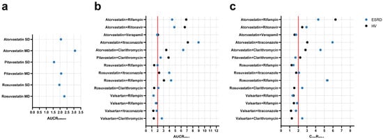 Simulated geometric mean ratios of muscle exposure and drug–drug interactions between healthy volunteers and ESRD patients. (a) muscle AUC; (b) AUC ratio; and (c) Cmax ratio. AUCRESRD/HV area under the curve ratio between ESRD patients and HVs; AUCRw/w-o area under the curve ratio with/without perpetrator; CmaxRw/w-o maximum plasma concentration ratio with/without perpetrator; SD single-dose; MD multiple-dose; HV, healthy volunteers; ESRD, end-stage renal disease patients.