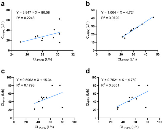 Comparison of predicted and observed clearance at the individual level. (a) The relationship between PBPK- and PPK-predicted DAB clearance before or (b) after corrected by LASSO analysis. (c) The relationship between PBPK- and PPK-predicted RSV clearance before or (d) after corrected by LASSO analysis. CLPPK population pharmacokinetic model-predicted clearance; CLPBPK physiologically based pharmacokinetic model-predicted clearance.