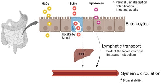 Lipid-based nanoparticles such as SLNs and NLCs are increasingly preferred for the delivery of anticancer phytochemicals due to their excellent biocompatibility, biodegradability, ability to encapsulate poorly water-soluble compounds, and potential for both passive and active targeting [110]. SLNs and NLCs offer significant advantages in the delivery of natural compounds, providing a stable foundation that overcomes many of the limitations associated with other nanocarriers in phytochemical delivery [111]. Typical transport mechanisms of lipid-based nanosystems are presented in Figure 1. SLNs and NLCs enhance the solubility and oral bioavailability of poorly water-soluble compounds by providing a lipid-based matrix that promotes absorption and protects the active ingredients from degradation caused by light, oxygen, moisture, and enzymatic activity [112]. These nanoparticles enable controlled and sustained drug release, enhance cellular uptake due to their nanoscale size, and exhibit biocompatibility, making them appropriate for multiple routes of administration [113,114]. Compared to SLNs, NLCs incorporate both solid and liquid lipids, which increases drug loading capacity and prevents drug expulsion during storage [115]. Additionally, lipid nanoparticles can promote lymphatic uptake, thereby bypass hepatic first-pass metabolism and further enhancing systemic bioavailability. Lipid-based nanomedicines are at the forefront of nanotechnology’s clinical translation, representing the majority of approved nano-delivery systems. They are widely used in cancer therapy, infectious diseases, pain management, and gene delivery [116,117]. Inhalable lipid-based nanoformulations derived from natural products demonstrate significant promise in the treatment of pulmonary diseases due to a range of advantages, including bypassing the hepatic first-pass metabolism, enabling rapid onset of action, and achieving high bioavailability [118]. These systems allow for localized drug delivery, resulting in high pulmonary drug concentrations at lower systemic doses, thereby minimizing systemic side effects and enhancing therapeutic efficacy. Moreover, the lipidic composition can improve drug solubility and stability, facilitate mucosal penetration, and provide sustained drug release.