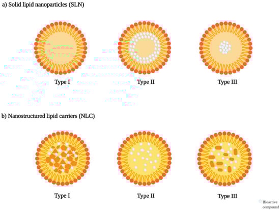 SLNs, colloidal drug delivery systems composed of nano-sized (10–1000 nm) lipid particles, are conventionally prepared by dispersing a solid lipid matrix in an aqueous phase containing a surfactant as a stabilizing agent [115]. SLNs have received significant attention in drug delivery systems owing to their numerous advantages, including improved physical and chemical stability, high drug loading capacity, customizable drug release profiles, potential for targeted delivery, enhanced bioavailability of poorly water-soluble drugs, excellent biocompatibility, and ease of sterilization [113,120]. SLNs offer enhanced protection for sensitive lipophilic drugs by preventing degradation due to the immobilization of these agents within the solid lipid matrix [121]. Additionally, they demonstrate great potential for administration through various routes such as oral, parenteral, ocular, pulmonary, nasal, rectal, transdermal, and vaginal delivery [122]. Moreover, SLNs can be efficiently produced on a large scale and scaled up using techniques such as high-pressure homogenization, hot-melt extrusion, and ultrasonication, facilitating their potential for commercialization [123]. The three varieties of SLNs are Type I (homogeneous matrix), Type II (drug-enriched shell), and Type III (drug-enriched core) according to their internal structure (Figure 2). The release characteristics and applicability of these categories vary from one another, and NLCs in medication dispersion.