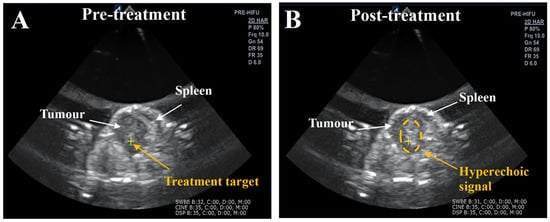 BH exposures (groups 3 and 4) were carried out using the Alpinion VIFU 2000 therapy ultrasound platform (Alpinion Medical Systems, Bothell, WA, USA) (Figure A1). The water tank and subjects were prepared as described in Appendix A. The positions of the PDAC tumour’s upper and lower edges were identified using the 3–12 MHz US imaging probe of the VIFU 2000 system. Subsequently, the central regions of the tumour were located and exposed under ultrasound imaging guidance to avoid damage to adjacent organs/tissues at risk (spleen, stomach, intestine, peritoneum, skin, and abdominal wall). To achieve this, no exposures were placed within ~2 mm of the tumour edges. The number of treated positions per tumour (10 to 30) was dependent on tumour size, and on how well it could be differentiated from its surroundings. Also, to achieve the safe delivery of ultrasound energy in every tumour, every time significant hyperechoic ultrasound signals were seen using real-time ultrasound imaging during exposure, the exposures were immediately stopped, and the treatment was moved to the next planned position. This is because, in our experience, over-treatment of murine orthotopic tumours with BH can have detrimental quality-of-life effects.