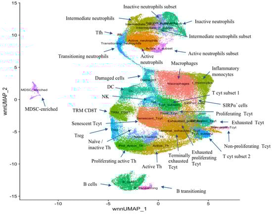 Neutrophils: Seven (7) neutrophil subsets were distinguished (Table 2A,B). They all expressed various protein levels of Ly6G (Figure A2D), overexpressed the genes ITGAM [33], FCGR3 [34], SELL, S100A8, and IFITM1 and were negative for CCL2 differentiating them from macrophages. Also, they expressed the CD14 gene which is expressed by neutrophils under inflammatory conditions [35,36]. All neutrophil subsets showed an N2-like (pro-tumour growth, immune suppressive) gene expression pattern by overexpressing ENTPD1 [37], CXCR2 [33], S100A9 [38], IL10R [39,40], CD177 [41,42], OSM [43], TGFβR [44] (all but the active neutrophils subset cluster), PDL1, and MMP9 [45], and by downregulating pro-inflammatory genes like NOX2 [46], IFN-γ, and IFN-γR that are commonly associated with an N1-like phenotype. All neutrophil clusters overexpressed the activation marker gene CD63 [47], TLRs, and TNF (Table 2A). These seven clusters were further separated into four large and three small clusters. The first of the large clusters was the activated-neutrophil cluster because these cells increased the transcription of genes associated with neutrophil activation including MMP8, a neutrophil degranulation marker [48], several INF-γ-inducible genes including CXCLL10, IFITM6, IFIT2, and TNFAIP6 which have been associated with the activation of innate immune response and M2 macrophage polarisation [49], and MRGPRA2B, the protein product of which acts as a detector of foreign elements on the surface of neutrophils (Table 2B). Another large neutrophil cluster was the intermediate-neutrophil cluster because, here, the transcription of activation genes was lower than that seen in the activated neutrophils cluster (e.g., MMP8, IFN-γ-responsive genes) or not expressed at all (TNFAIP6, MRGPRA2B, CXCL10 [33]) (Table 2B). The third large neutrophil cluster was annotated as the inactive-neutrophils because it showed no overexpression of all the above-mentioned biomarkers (Table 2B). In addition, three smaller clusters were distinguished. The cells in the active-neutrophils subtype cluster expressed similar biomarkers to the active neutrophils including several IFN-stimulated genes (e.g., IFITM6, IFIT2, IFIT3, IFIT1) and MMP8, but did not overexpress CXCL10 and Dach1 (Table 2B). The intermediate-neutrophil subtype cluster had a similar expression pattern to the intermediate neutrophils, and in addition, expressed high levels of the SIGLECF gene (Table 2B). Neutrophils that overexpress SIGLECF have been shown to promote tumour growth and the suppression of the immune system [50]. The inactive-neutrophil subtype had a similar expression pattern to the inactive neutrophils lacking the overexpression of the IFN-stimulated genes, CXCL10, TNFAIP6, and MMP8. Again, this cluster showed high overexpression of SIGLECF and IL23A; the latter was not seen in the inactive-neutrophil cluster (Table 2B). Finally, the transitioning-neutrophil cluster was identified as such due to its location in the UMAP and the overexpression of genes associated with both the active and intermediate neutrophils. Annotation decisions for all remaining clusters are discussed in the manual annotation discussion section of Appendix A.