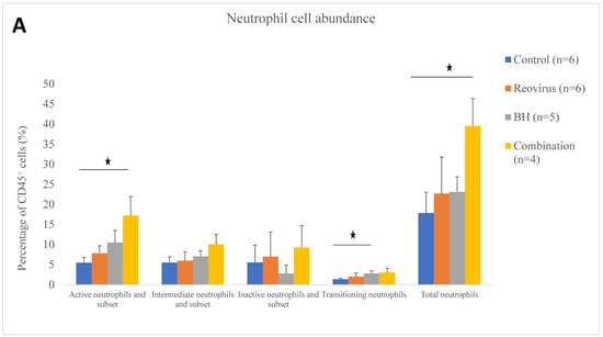 The relative abundance of the 30 immune cell subtypes (compared to the total leukocyte abundance) in the tumours 24 h after sham, BH, reovirus, and combination treatments is shown in Figure 4, Figure A3 and Figure A4A and Table 3. The statistical significance of the results for each cell type in the treatment groups compared to the sham-exposed subjects is shown in Table A4. Statistically significant increases were seen in the abundance of the transitioning neutrophils (2.1-fold) for the BH group compared to that in the control group (Figure 4A), as well as for the aggregated active neutrophils (3.1-fold) (Figure 4A), total neutrophils (active, intermediate, inactive, and transitioning clusters and subsets) (2.2-fold) (Figure 4A), and the total neutrophil to total lymphocyte (CD8 T cells, CD4 T cells, NK, and B cells) ratio (NLR) (3.2-fold) (Figure A3) in the tumours of the combination group compared to the sham-exposed subjects. When the reovirus group and the BH group were compared to the sham-exposed group, no statistically significant differences were seen in the neutrophil abundance or the NLR.