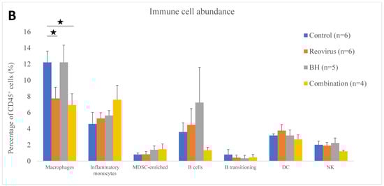 Relative abundance of immune cells in pancreatic tumours 24 h after treatment. The percentages of the various immune cells identified in this study are shown as a proportion of the total leukocytes (CD45+ cells) for (n = 6) sham-exposed control tumours (blue) and for (n = 6) subjects in the reovirus (orange), (n = 5) BH (grey), and (n = 4) combined treatment (yellow) groups in (A) for neutrophils, in (B) for macrophages, inflammatory monocytes, MDSC-enriched cells, B cells, B transitioning cells, DC and NK cells, in (C) for CD4+ lymphocytes, and in (D) for CD8+ lymphocytes. Results are shown as averages ± SEM. Statistical significance (p < 0.05) is denoted with an asterisk.
