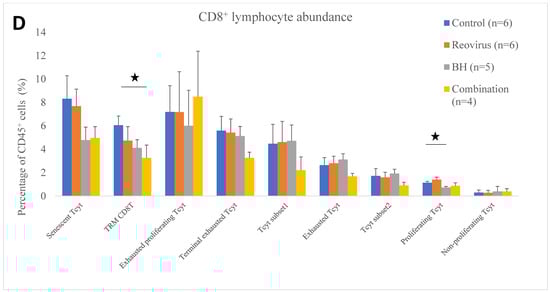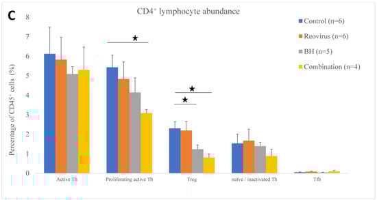 Statistically significant decreases in the abundance of macrophages (1.8-fold) (Figure 4B), proliferating active Th (1.8-fold) (Figure 4C), regulatory T cells (Treg) (2.9-fold) (Figure 4C), TRM CD8T (1.9-fold) (Figure 4D), and total B cells (B cells + B transitioning) (2.4-fold) (Figure A4A) were seen in the combination-treated subjects compared to the sham-exposed ones. Statistically significant decreases were also seen for the Treg (1.9-fold) (Figure 4C) and proliferating Tcyt (1.6-fold) (Figure 4D) of the BH-exposed group and for the macrophages (1.6-fold) of the reovirus treated group (Figure 4B) compared with the sham-exposed group.