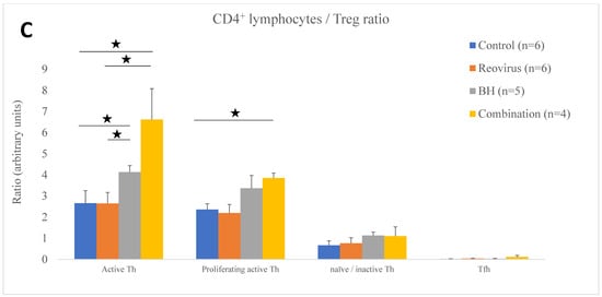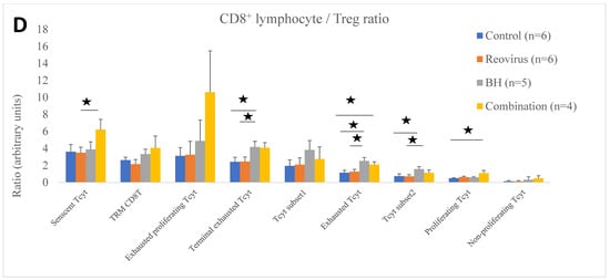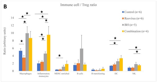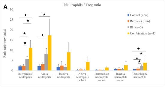 Statistically significant differences in the ratio of immune cells to Treg were also seen between treatment groups. Compared to the reovirus-treated subjects, the combined treatments increased the ratios of the intermediate neutrophils to Treg (4.8-fold), and transitioning neutrophils (4.2-fold) (Figure 5A), inflammatory monocytes (4.0-fold), macrophages (2.5-fold), NK cells (1.7-fold) (Figure 5B), active Th (2.5-fold) (Figure 5C), and senescent Tcyt (1.8-fold) (Figure 5D). Also, the combined treatments increased the ratio of the inflammatory monocytes to Treg (2.1-fold) when compared to the BH-only exposures (Figure 5B). The BH exposures, compared to the reovirus-only treatments, resulted in increased ratios of intermediate neutrophils to Treg (2.4-fold), and transitioning neutrophils (2.5-fold) (Figure 5A), macrophages (2.8-fold), inflammatory monocytes (1.9-fold) (Figure 5B), active Th (1.6-fold) (Figure 5C), terminal exhausted Tcyt (1.7-fold), exhausted Tcyt (2.0-fold), and Tcyt subset2 (2.2-fold) (Figure 5D).