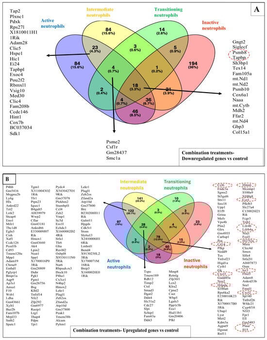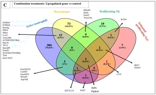 Compared to the sham-exposed controls, the combined treatments differentially modulated more genes (>2-fold) than the reovirus-alone and BH-alone treatments combined. In total, the transcription of ~2600 genes was affected among all cell clusters (Table 5) with ~1700 genes significantly increasing their expression and ~950 genes decreasing their expression after the combined treatments. The cell types with the highest DEG were the active, intermediate, and inactive neutrophils (>500 genes differentially modulated in each cell type), the transitioning neutrophils and cells of monocytic origin such as the macrophages and inflammatory monocytes (>140 genes differentially modulated), followed by the Th cells and various Tcyt clusters (Table 5). Also, after the combined treatments, 18 genes were commonly downregulated (Figure 6A), and 78 genes were commonly upregulated (Figure 6B) among the active, intermediate, transitioning, and inactive neutrophils compared to the controls. In addition, the XAF1 and PYDC4 genes were commonly upregulated among the active neutrophils, macrophages, proliferating Th, and exhausted proliferating Tcyt after the combination treatments (Figure 6C).