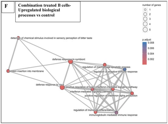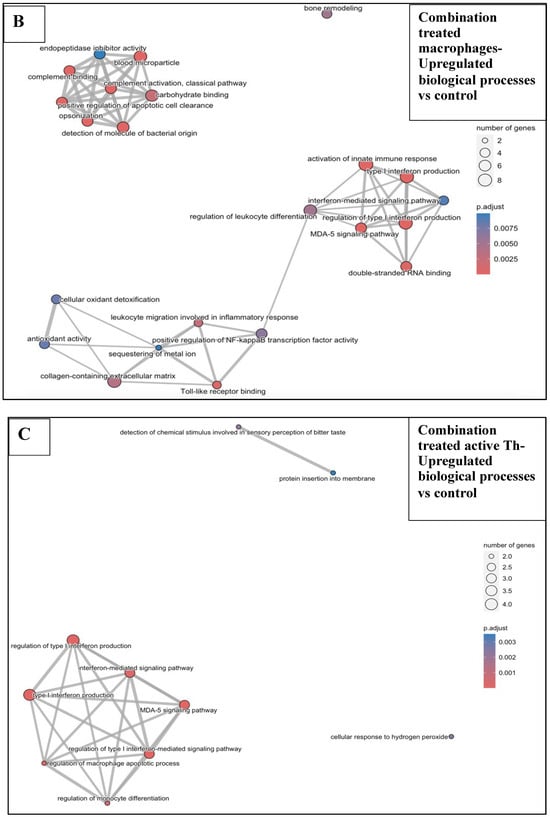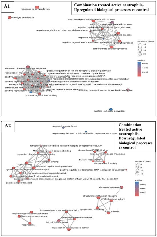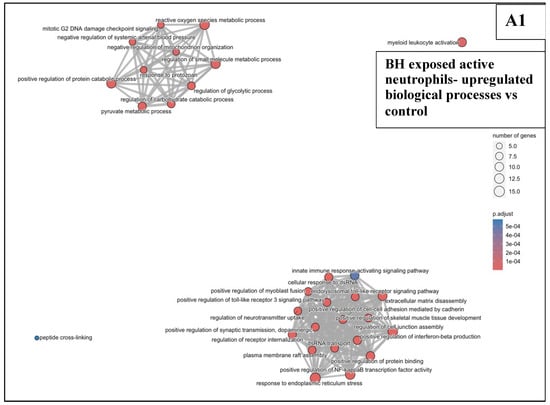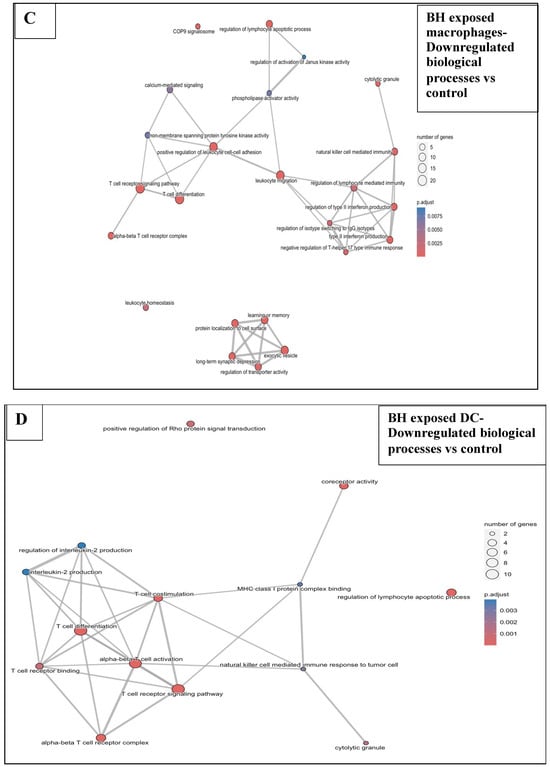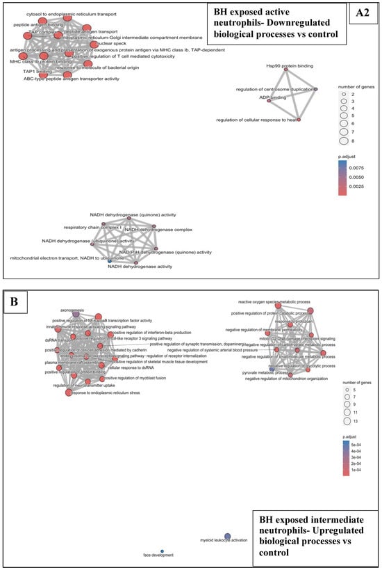 BH treatments caused the overexpression of genes (an example shown for active neutrophils in Figure A6B) associated with the innate immune response, for example, TLR3 signalling, NF-kB signalling, and IFN-β production, in active (Figure 7A1) and intermediate (Figure 7B) neutrophils 24 h after treatment. But here at least some downregulated genes (Figure A6B) were associated with the transporter associated with antigen processing (TAP)-dependent class I major histocompatibility (MHC) complex, the ABC-type peptide antigen transported activity, and T cell-mediated cytotoxicity (Figure 7A2). In macrophages, downregulated genes (Figure A6C) were associated with type II IFN production, NK cell and lymphocyte-mediated immunity, the α/β T cell receptor complex, T cell receptor signalling, and T cell differentiation, migration, and cell adhesion (Figure 7C). In DC, BH treatments downregulated genes (Figure A6D) that were associated with the α/β T cell activation, IL-2 production, T cell costimulation differentiation activation and signalling, and a small number of genes associated with the TAP and class I MHC complexes, and the NK mediated anti-cancer immune response (Figure 7D).