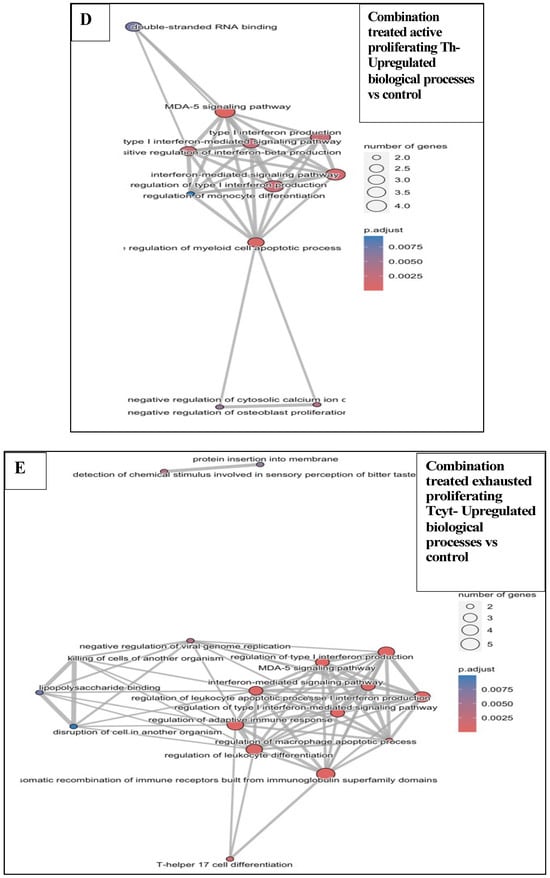 Twenty-four (24) hours after treatment of the KPC tumours, in active neutrophils, the combined treatments increased the transcription of genes (Figure A6E) associated with the NF-kβ transcription factor activity, TLR3 signalling, IFN-β production, myeloid leukocytes activation, and chemotaxis compared to the sham-exposed controls (Figure 8A1), whereas downregulated active neutrophil genes (Figure A6E) were associated with the TAP1 complex binding, antigen processing and presentation, and the regulation of T cell-mediated immunity (Figure 8A2). Some of these pathways were also modulated in the other major neutrophil clusters including the intermediate, transitioning, and inactive neutrophils (Figure A8). In macrophages, the overexpressed genes (Figure A6F) were associated with various innate immunity-related processes including type I IFN production, the MDA-5 signalling, the classical pathways of the complement activation, the clearance of apoptotic cells, TLR binding, and the NF-kB transcription factor activity (Figure 8B). In Th cells, the combination treatments led to increases in genes associated with type I IFN production and signalling and MDA-5 signalling in active Th (Figure 8C) and proliferating active Th (Figure 8D), and with the IFN-β production in the proliferating active Th (Figure 8D). In exhausted proliferating Tcyt upregulation of genes associated with the type I interferon (IFN) production, the MDA-5 signalling pathway, the negative regulation of virus replication, the regulation of the macrophage apoptotic process, the regulation of the adaptive immune response and the somatic recombination of immune receptors built from IgG superfamily domains were seen (Figure 8E). Finally, in B cells, positive regulation of type I IFN signalling pathways as well as genes associated with the IgG-mediated immune response and defence responses to virus infections were seen in the combination vs. sham-exposed controls (Figure 8F).
