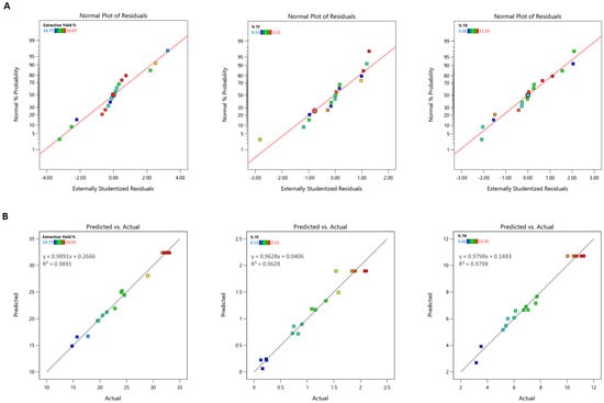 (A) Normal plot of residuals for extraction yield, percent of theaflavins (%TF), and percentage of thearubigins (%TR). (B) Predicted vs. actual plots for extraction yield, percentage of theaflavins (%TF), and percentage of thearubigins (%TR).