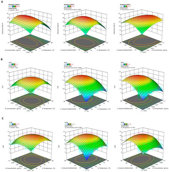 Surface plot and contour plot showing the effects of temperature, concentration, and solvent on (A) extraction yield, (B) % of theaflavins (%TF), and (C) % of thearubigins (%TR).