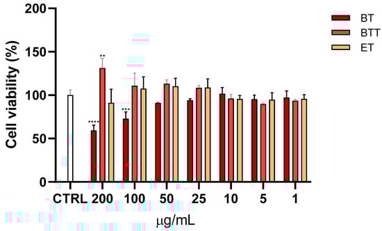 The MTT test was utilized to evaluate cell viability because it quantifies how the cellular mitochondrial dehydrogenase enzyme, which is only active in live cells, converts the yellow, water-soluble substrate MTT into purple formazan crystals. The effects of different concentrations (1–200 μg/mL) of BT in solution or in transfersomes, or empty transfersomes on the viability of NHDF cells was evaluated. The cell viability was measured after 24 h of treatment and is presented as a percentage relative to the control group (CTRL), which represents 100% viability (Figure 4). At higher concentrations (200 and 100 μg/mL), BT significantly reduced cell viability compared to the control, while the cytotoxicity was prevented by the incorporation into the transfersomes. Empty transfersomes maintained cell viability close to the control levels across all tested concentrations, indicating that the nanocarrier itself did not affect cell viability.