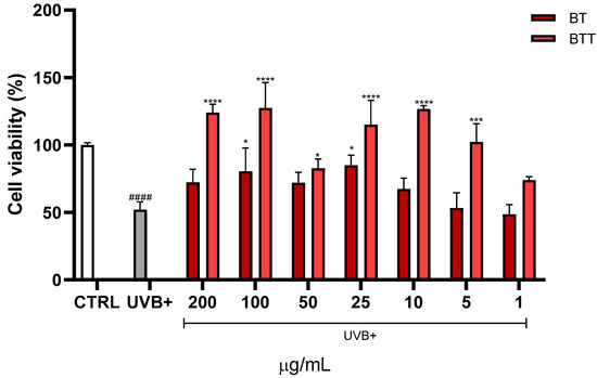 The protective effects of BT and BT transfersomes against UVB-induced loss of viability was investigated. MTT assay was performed after treating NHDF cells with increasing concentrations of the extract (1–200 μg/mL) before UVB exposure (Figure 5). UVB exposure significantly decreased cell viability compared to the CTRL group (p < 0.0001). Notably, BT transfersomes provided a significantly greater protection at 100 μg/mL and 200 μg/mL compared to BT in its free form (i.e., in DMSO solution).