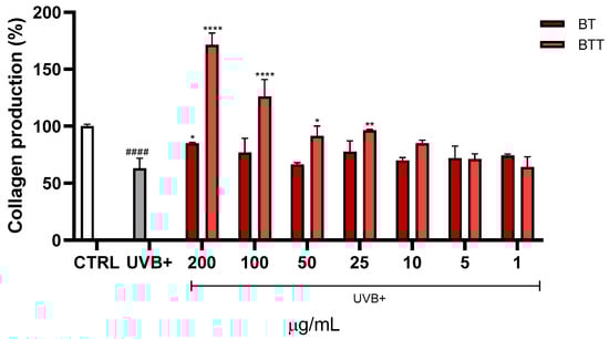 Collagen production was evaluated using Sirius red staining of Normal Human Dermal Fibroblasts (NHDF) treated for 24 h with different concentrations (1–200 μg/mL) of black tea extract in solution (BT) or in transfersomes (BTT), then irradiated with UVB (100 mJ/cm2). Data are expressed as the mean ± SD of three independent experiments (n = 3) and were analysed using one-way ANOVA, followed by Tukey’s post-hoc test. **** p < 0.0001, ** p < 0.01, * p < 0.05 vs. UVB+, #### p < 0.0001 vs. CTRL (100% collagen production).