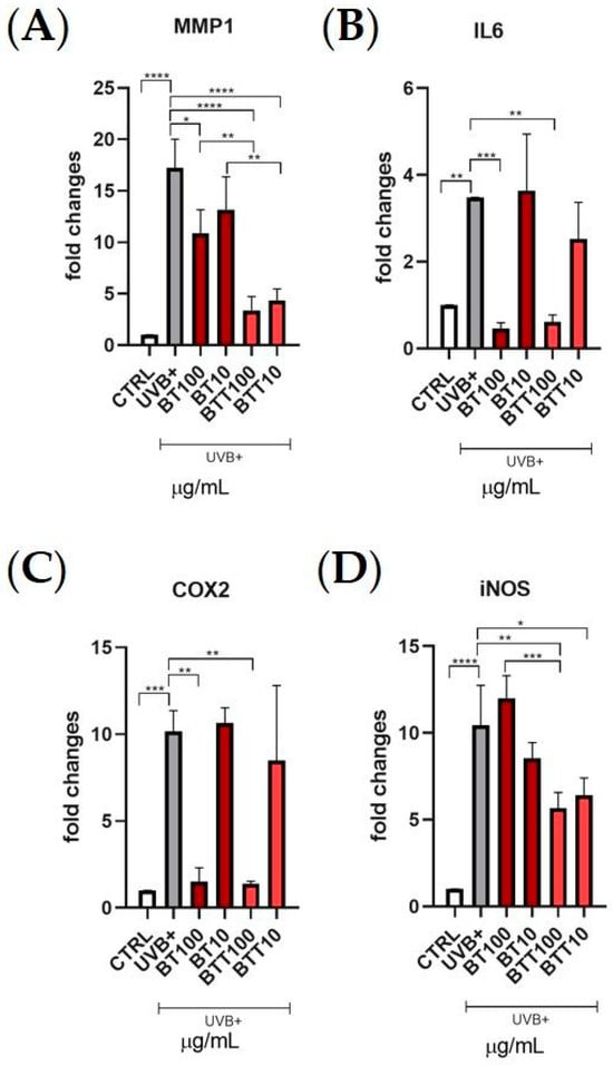 NHDF cells were seeded into 6-well plates (3 × 105 cells/well) and were pre-treated with BT in DMSO solution and BT in transfersomes (10 and 100 μg/mL) for 24 h, and then cells underwent UVB irradiation as described above. Total RNA was extracted from treated or untreated cells using the RNeasy Mini Kit (Cat.no 74106; QIAGEN, Hilden, Germany) and transcribed to cDNA using the high-capacity cDNA reverse transcription kit (Thermo Fisher Scientific, Miami, FL, USA), according to the manufacturer’s instructions. The strands obtained were used as templates for quantitative real-time PCR (qRT-PCR) using SYBR Green qPCR master mix (Cat. no. 4309155; Thermo Fisher Scientific, Monza, Italy) and a 7500 Fast Real-Time PCR System (Applied Biosystems, Foster City, CA, USA) [25]. β-Actin mRNA levels were used as internal controls. The primers used in this study were the following: β-actin, forward 5′-CCTGGCACCCAGCACAAT-3′ and reverse 5′-GCCGATCCACACGGAGTACT-3′; MMP-1, forward 5′-CTGGCCACAACTGCCAAAT-3′ and reverse 5′-CTGTCCCTGAACAGCCCAGTACTTA-3′; IL-6, forward 5′-CTACTCTCAAATCTGTTCTGG-3′ and reverse 5′-GGATTCAATGAGGAGACTTG-3′; COX-2, forward 5′-CAGCACTTCACGCATCAGTT-3′ and reverse 5′-CAGCAAACCGTAGATGCTCA-3′; iNOS, forward 5′-AGAGAGATCGGGTTCACA-3′ and reverse 5′-CACAGAACTGAGGGTACA-3′.