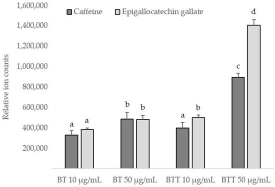 The intracellular uptake of BT delivered by the transfersomes was assessed in comparison with that obtained after exposure of NHDF cells to the free extract. LC-MS/MS analyses were performed, and caffeine and epigallocatechin gallate were used as marker compounds for relative quantification purposes; in fact, these compounds are the main active ingredients in tea and are known for their physiological functions [26,27]. The results in Figure 8 show that there was a slight yet significant increased content of both markers using the free extract at the higher concentration (50 µg/mL). Similar values were found in the cells exposed to the lower concentration of BT in transfersomes (10 µg/mL). This means that BT transfersomes were basically as effective as BT on its own at a 5-times higher concentration. Furthermore, when BT was delivered by the transfersomes, at 50 µg/mL, the intracellular amounts of caffeine and epigallocatechin gallate were ~1.8- and ~3-fold higher than those found after BT solution application, at the same concentration.
