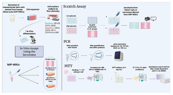 Schematic representation of the in vitro treatment of keratinocyte cells with the secretome derived from human mesenchymal stem cells. The figure illustrates the isolation of mesenchymal stem cells, phenotypic characterization, differentiation methodology, and cell culture for subsequent secretome collection. The secretome was applied in scratch assays, treatments with secretome and/or LPS, and cell viability analysis. Scratch assay, real-time PCR, and MTT assays were performed. * In vitro differentiation. The diagram was created using BioRender.com. Created in BioRender. Payão, T. (2025) https://BioRender.com/e4ub5w8.