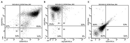 The phenotypic characterization of hDP-MSCs was performed in accordance with current guidelines and the criteria established in the recent literature [23,24]. The MSC lines were assessed for specific surface markers via flow cytometry, evaluating the expression of CD73, CD90, CD105, CD45, CD34, and HLA-DR. Monoclonal antibodies were obtained from BD Biosciences and used as follows: anti-CD73 (cat. no. 550257), anti-CD90 (cat. no. 581969), anti-CD105 (cat. no. 560839), anti-CD45 (cat. no. 555493), anti-CD34 (ref. no. 348053), and anti-HLA-DR (cat. no. 555560).