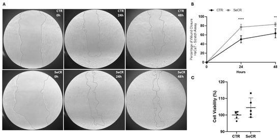 Following scratch induction, cells were treated under two experimental conditions: the control group (CTR group) received conditioned medium from HaCaT cells, while the experimental group (SeCR group) was treated with secretome obtained from hDP-MSCs. Wound closure and cell migration were monitored at 0, 24, and 48 h post-treatment using phase-contrast microscopy with an inverted microscope.