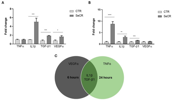 Subsequently, the gene expression profile of classical mediators involved in the wound healing process was evaluated after 6 and 24 h of cell culture with the MSC-derived secretome. After 6 h, significant upregulation of interleukin-1 beta (IL-1β) (p < 0.001), transforming growth factor beta 1 (TGF-β1) (p < 0.001), and vascular endothelial growth factor (VEGFα) (p < 0.05) was observed in the secretome-treated group compared to the control (Figure 5A). Treatment with the secretome for 6 h did not modulate TNF-α gene expression compared to the control group (p > 0.99; Figure 5A).