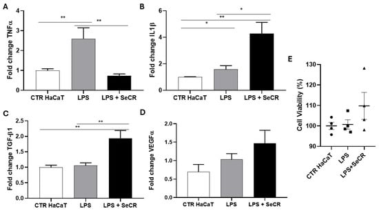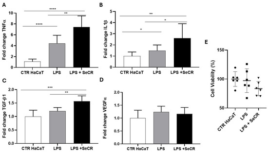 As for VEGF-α, no statistically significant differences were observed among the experimental groups (CTR HaCaT vs. LPS: p = 0.0995; CTR HaCaT vs. LPS + SeCR: p = 0.2590; LPS vs. LPS + SeCR: p = 0.5455; Figure 7D), suggesting that the angiogenic response remains relatively unaltered under the tested conditions after 24 h of LPS stimulation.