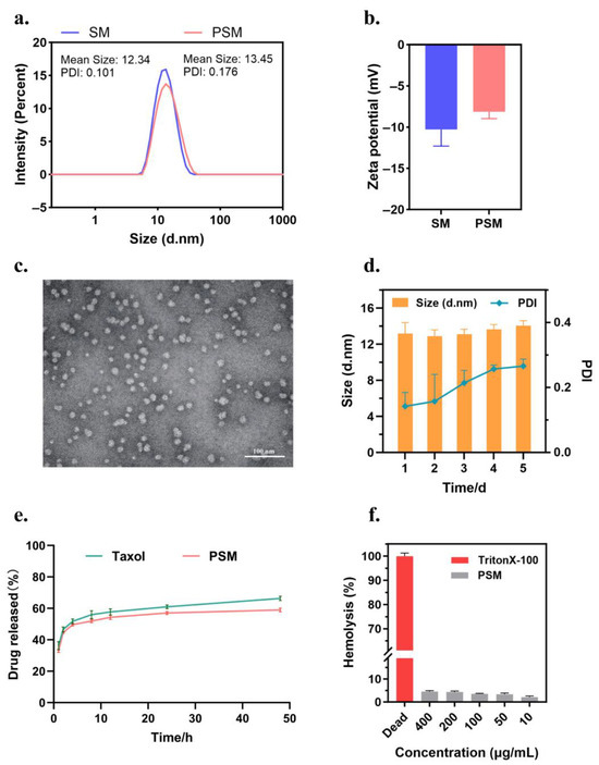 Figure 1. (a) Particle size of blank SM and drug-loaded PSM with PDI. (b) Zeta potential of SM and PSM. (c) TEM observation of PSM with scale bar of 100 nm. (d) Five-day stability of PSM stored at 4 °C, including particle size and PDI changes. (e) Cumulative in vitro release profile of PSM with Taxol in PBS release medium at pH = 7.4. (f) Quantitative statistics of haemolysis rate at different concentrations of PSM. Data plots and error bars represent mean ± SD (n = 3).