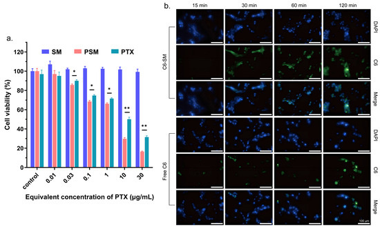 Figure 2. (a) Proliferation inhibition of SM, PSM, and PTX at different concentrations in C6 cells by CCK-8 assay. (b) Uptake of free Cou-6 and Cou-6 SM by C6 cells at different times, blue for DAPI, green for Cou-6, scale bar = 100 μm. Data plots and error bars represent mean ± SD (n = 5), * p < 0.05, ** p < 0.01.