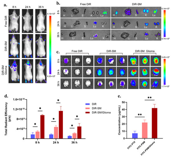 Figure 3. (a) Representative images of orthotopic in vivo fluorescence imaging of healthy mice treated with free DiR, DiR-SM, and hormonal mice treated with DiR-SM at 8 h, 24 h, and 36 h. Results are shown below. (b) Representative images of ex vivo organ fluorescence imaging of healthy mice receiving free DiR, DiR-SM treatment at 8 h, 24 h, 36 h, H is for heart, Li is for liver, S is for spleen, Lu is for lungs, K is for kidneys. (c) Fluorescence imaging of isolated brain tissue and (d) corresponding radiant efficiency quantification results in healthy mice treated with free DiR, DiR-SM and in tumour-bearing mice treated with DiR-SM at 8 h, 24 h and 36 h. (e) Brain tissue homogenate drug concentration in healthy mice treated with free FITC-PTX, FITC-PSM and tumour-bearing mice treated with FITC-PSM at 24 h. Data plots and error bars represent mean ± SD (n = 3), * p < 0.05, ** p < 0.01.