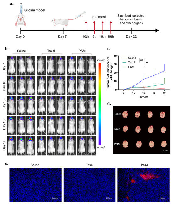 In this study, the inhibitory effect of PSMs on tumour growth was systematically evaluated by establishing a C6Luc in situ glioma mouse model and compared with the clinically used chemotherapeutic drug Taxol. As shown in Figure 4a, the experiment was set up with a standardised treatment cycle regimen, and tumour growth was dynamically monitored using bioluminescence imaging during the administration period, and an anatomical assessment and safety analysis were performed at the endpoint of the experiment. The results of quantitative bioluminescence analysis showed (Figure 4b,c) that there were significant differences between the different treatment groups: the saline control group exhibited the fastest rate of tumour growth, with a terminal bioluminescence intensity of more than 7 × 106 p/s/cm2/Sr, which was an average of a 22-fold increase from the baseline level; the Taxol treatment group, though, showed a certain inhibitory trend, with a terminal luminescence intensity of 1.5 × 106p/s/cm2/Sr (a 6.7-fold increase on average), but there was no statistically significant difference compared with the control group (p > 0.05); and notably, the PSM treatment group showed the most excellent tumour suppression effect, with its terminal luminescence intensity remaining below 1 × 106 p/s/cm2/Sr, with an average increase of only 1.1-fold, and with a significant difference from the control group. These data suggest that PSMs can effectively inhibit the growth of brain gliomas, and its efficacy is significantly better than that of Taxol.