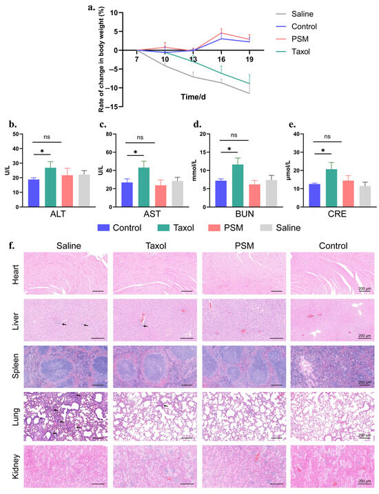 Figure 5. (a) Changes in body weight of mice during systemic administration. (b) ALT values of serum samples taken from mice in control, Taxol, PSM and saline groups. (c) AST values of serum samples extracted from mice in the control, Taxol, PSM and saline groups. (d) BUN values of serum samples extracted from mice in control, Taxol, PSM and saline groups. (e) CRE values of serum samples extracted from mice in control, Taxol, PSM and saline groups. (f) H&E staining of major organ sections of mice in control, saline, Taxol, and PSM groups, arrows represent metastatic tumour lesions. Scale bar = 200 μm. Data plots and error bars represent mean ± SD (n = 4), * p < 0.05, ns for p > 0.05.