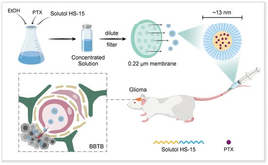 PTX, as a broad-spectrum antitumour agent, has not been approved for the clinical treatment of gliomas, although it has demonstrated significant efficacy in the treatment of a wide range of malignant tumours, mainly due to its difficulty in achieving effective therapeutic concentrations in brain tumour lesions [22]. Although some studies have reported that Taxol can detect PTX accumulation in the focal tissues of glioma patients, the levels in normal brain tissues are below the limit of detection (thanks to the permeability of the BBTB and the micellar properties of Taxol) [23]. Due to its serious adverse effects, Taxol has been gradually replaced by injectable paclitaxel liposomes and Abraxane®. However, the larger particle size of the latter two rather limits their BBTB penetration ability. Most glioma studies have focused on breaching the BBB, ignoring the fact that the BBTB is the main obstacle to glioma treatment [18]. Existing targeting strategies (e.g., ligand modification, magnetic targeting, ultrasound-assisted or transnasal drug delivery) [24,25] are mainly aimed at the penetration of the intact BBB, and these approaches, although suitable for the treatment of neurodegenerative diseases, are not optimal for gliomas. Although these techniques can facilitate drug entry into the brain and navigation to the tumour site, the resulting distribution of the drug throughout the brain may cause damage to normal brain tissue, and the complex preparation process hinders clinical translation.