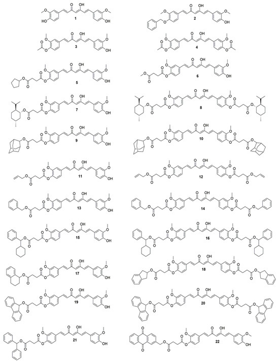 The chemical structures of curcumin and the curcumin derivatives 2–22 are shown in Figure 2. These derivatives were previously synthesized by our group [30,40]. Compounds 2–4 were synthesized by etherification and esterification of curcumin. Compounds 5–22 were synthesized by forming a succinate (linker) and then esterifying curcumin. Some compounds (4–5, 11–14) were repurified before their biological activities were evaluated (Supplementary Data). All the compounds (1–22) were prepared to evaluate their biological activities.